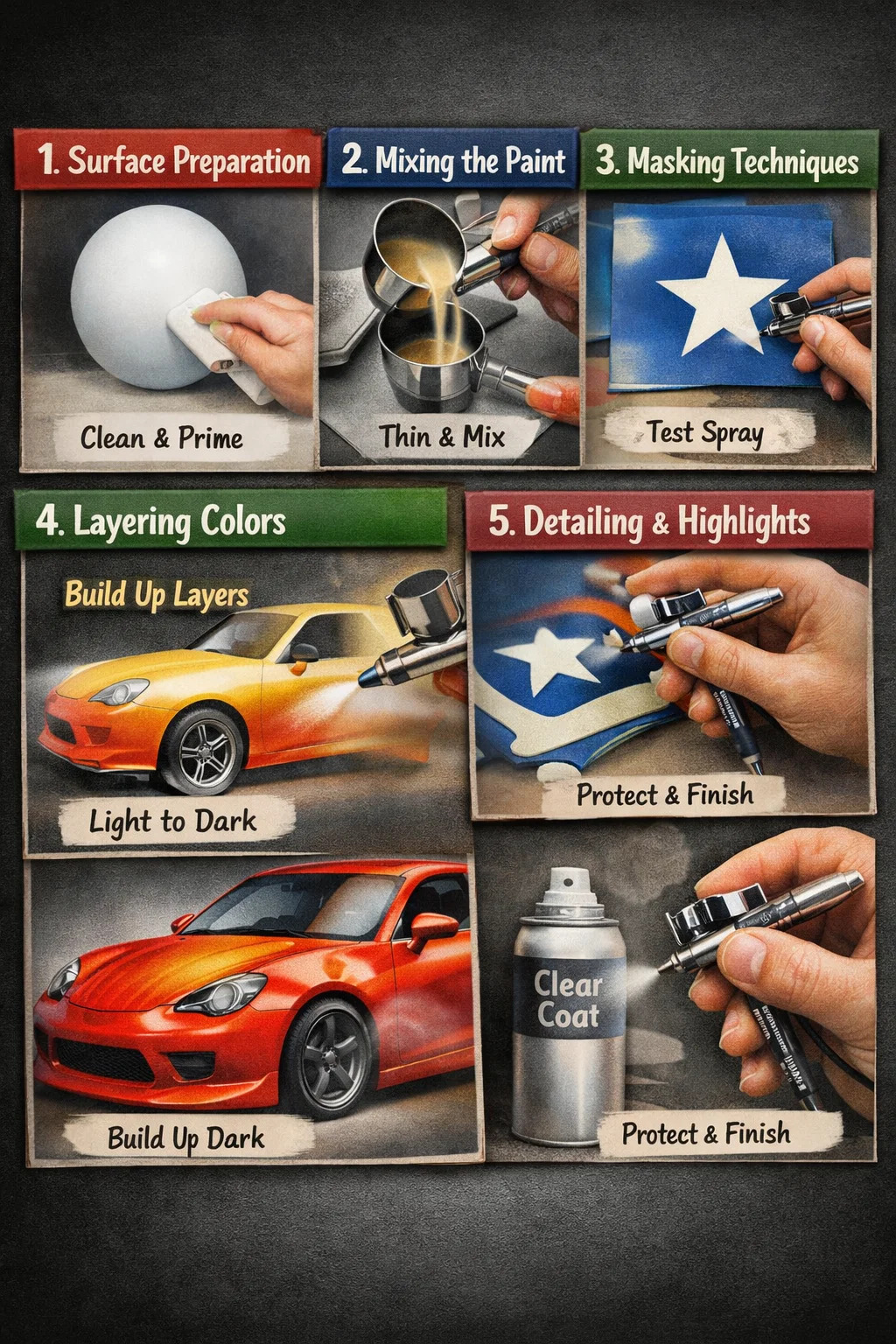 Freehand spraying: If you are aiming for a hazy, soft effect (such as clouds or skin shadows), you can spray freehand without masking, utilizing the atomization properties of the airbrush.
