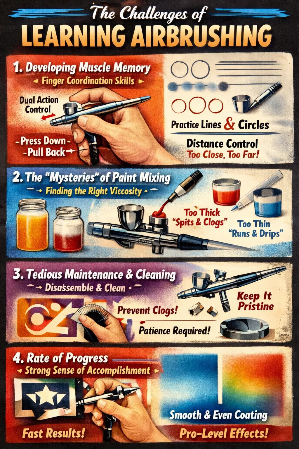Diligence is key: Many beginners find it difficult to use because the airbrush isn't cleaned properly, leading to blockages. Learning how to quickly disassemble and clean the nozzle and needle is a must for every beginner.