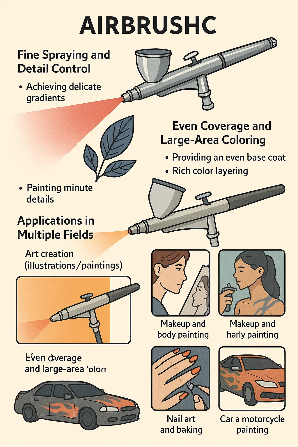 --Makeup and body painting: In stage, film, or bridal makeup, airbrush makeup provides a lightweight, long-lasting, and even base. Used for body or fabric painting for performances or fashion decoration.