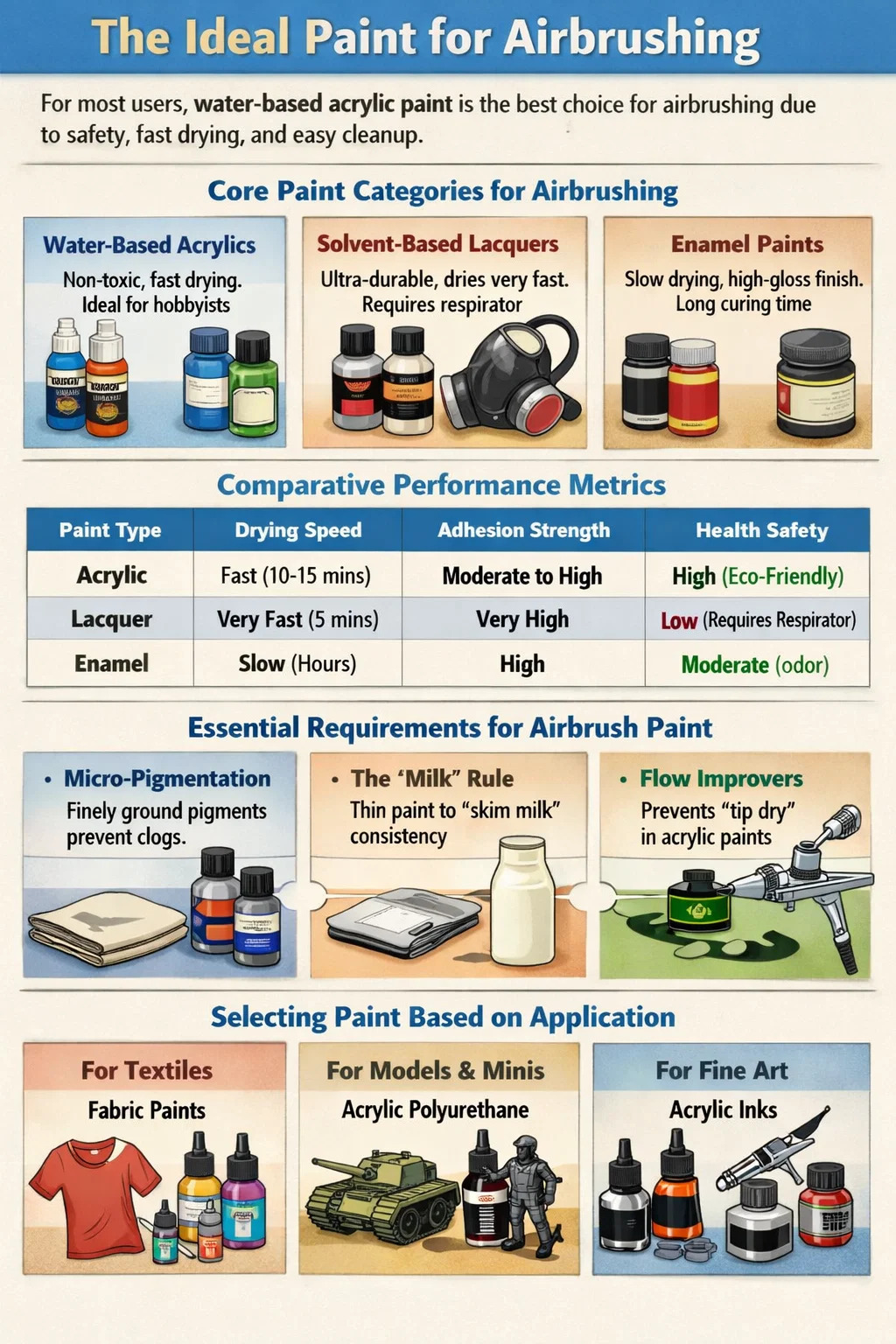 For the vast majority of users, water-based acrylic paint is the best choice for airbrushing. It offers an optimal balance of non-toxic safety, rapid drying times, and easy cleanup with simple water or specialized cleaners. While advanced hobbyists may utilize lacquers for extreme durability, acrylics are the industry standard for general illustration, scale modeling, and textile work due to their versatility across various surfaces and minimal chemical odor.
